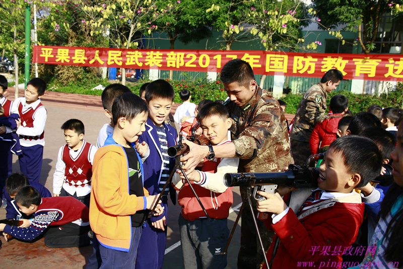 12月18日,平果县人民武装部到平果县第五小学举行国防教育进校园活动,4000多名小学生现场观摩和亲自体验了轻武器操作使用,接受了一次国防教育和爱国主义思想的熏陶。